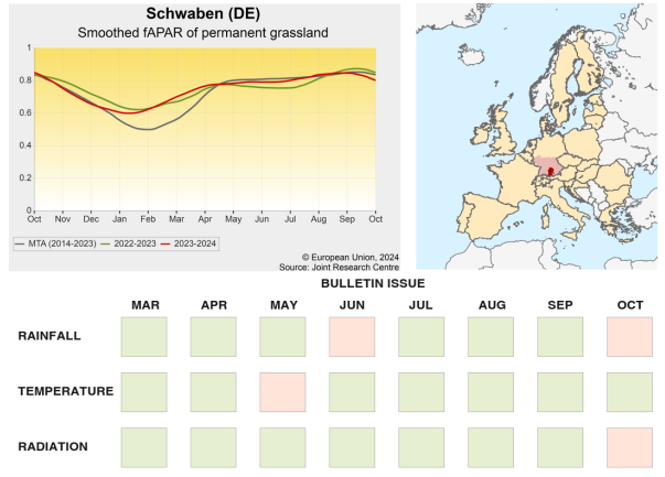 В северной и центральной Италии уровень продуктивности пастбищ выше МТА, несмотря на избыток осадков. Однако чрезмерно влажные условия ограничили доступ к полям и привели к задержке сбора зеленой массы кукурузы, а также к риску того, что поздние посевы не достигнут зрелости. На юге Италии влажность почвы остается низкой, но средние температуры и эпизодические дожди способствовали образованию биомассы. В большинстве северных районов Испании и Португалии накопление биомассы близко к МТА или превышает его. Однако на северо-западе избыточная влажность почвы негативно сказалась на накоплении биомассы и привела к задержке уборки зеленой массы кукурузы. На юге Испании и Португалии недавние дожди благоприятно сказались на состоянии лугов, которые скоро выйдут из летней спячки.