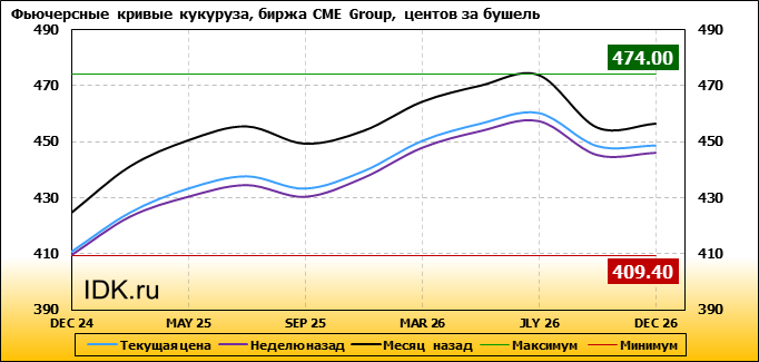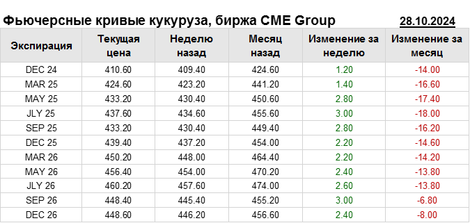 На 28.10.2024 стоимость кукурузы на бирже CME Group по контракту DEC 24 составила 410.6 центов за бушель. За прошедшую неделю стоимость кукурузы на площадке CME Group выросла на 1.2 цента/бушель. Как мы видим на графике, фьючерсная кривая имеет периоды, когда более дальний фьючерс дешевле ближнего. Состояние бэквардации наблюдаем на следующих контрактах: SEP 25; SEP 26. Таким образом, трейдеры предполагают, что возможно превалирование предложения над спросом в указанные периоды.