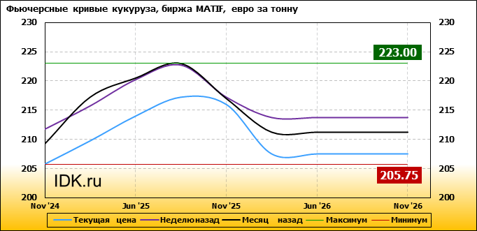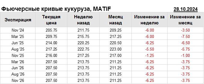 На 28.10.2024 стоимость кукурузы на бирже MATIF по контракту Nov ’24 составила 205.75 евро за тонну. За прошедшую неделю стоимость кукурузы на европейской площадке упала на 6 евро/тонна. Как мы видим на графике, фьючерсная кривая имеет периоды, когда более дальний фьючерс дешевле ближнего. Состояние бэквардации наблюдаем на следующих контрактах: Nov ’25; Mar ’26. Таким образом, трейдеры предполагают, что возможно превалирование предложения над спросом в указанные периоды.