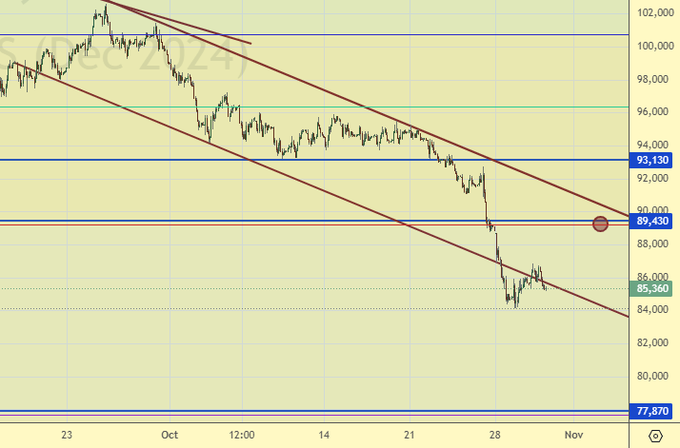 Продажа: после падения ниже 84900. Стоп: 86100. Цель: 78000. Или при подходе к 89400. Стоп: 89800. Цель: 80000 (70000).
