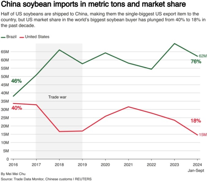 По данным китайской таможни, в этом году доля импорта сои в Китай из США снизилась до 18% с 40% в 2016 году, а доля Бразилии выросла с 46% до 76%.