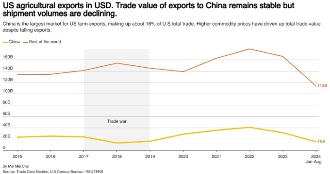 Угроза торговой войны нависла над Китаем, крупнейшим в мире импортером сельскохозяйственной продукции, такой как соя и кукуруза, поскольку кандидат от Республиканской партии Дональд Трамп ввел всеобъемлющие 60-процентные пошлины на китайские товары в попытке стимулировать производство в США.