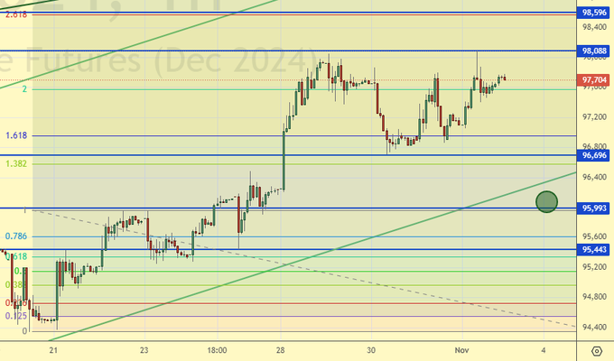 Дадут ли нам 96000 до посещения 99500, вот в чем вопрос. Шансы еще есть, но если закрепляемся выше 98100, то тогда пара продолжит идти вверх.