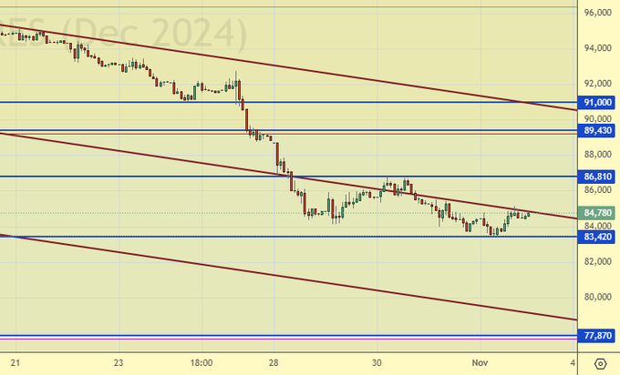 Слабовато. Слабовато выглядим. Движение вниз остается предпочтительным. Да, хотелось бы увидеть 89400 до посещения 78000, но не факт, что такое чудо произойдет. Если ставка останется высокой еще год, а скорее так и будет, предприятия начнут загибаться под её гнетом.