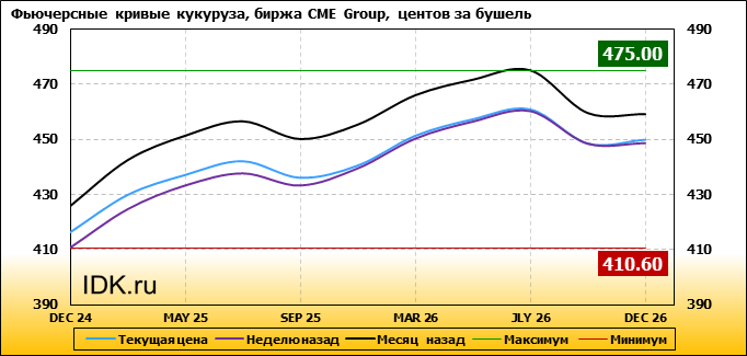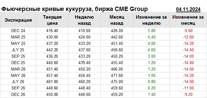 На 04.11.2024 стоимость кукурузы на бирже CME Group по контракту DEC 24 составила 416.4 цента за бушель. За прошедшую неделю стоимость кукурузы на площадке CME Group выросла на 5.8 цента/бушель. Как мы видим на графике, фьючерсная кривая имеет периоды, когда более дальний фьючерс дешевле ближнего. Состояние бэквардации наблюдаем на следующих контрактах: SEP 25; SEP 26. Таким образом, трейдеры предполагают, что возможно превалирование предложения над спросом в указанные периоды.