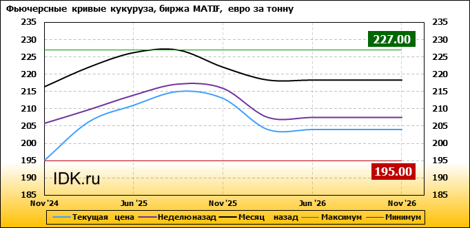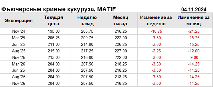 На 04.11.2024 стоимость кукурузы на бирже MATIF по контракту Nov ’24 составила 195 евро за тонну. За прошедшую неделю стоимость кукурузы на европейской площадке упала на 10.75 евро/тонна. Как мы видим на графике, фьючерсная кривая имеет периоды, когда более дальний фьючерс дешевле ближнего. Состояние бэквардации наблюдаем на следующих контрактах: Nov ’25; Mar ’26. Таким образом, трейдеры предполагают, что возможно превалирование предложения над спросом в указанные периоды.