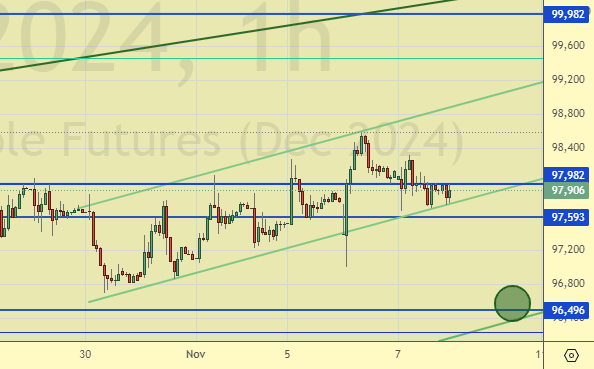 К сожалению, приходится констатировать, что дальнейшее развитие событий может быть скачкообразным. В любую сторону. Явно пока не рекомендуем, но отмечаем перспективность любых покупок в случае роста выше 98200. Также интересным будет вход в лонг от района 96000. А так с тревогой ждем заявлений нового-старого хозяина американского Белого дома.