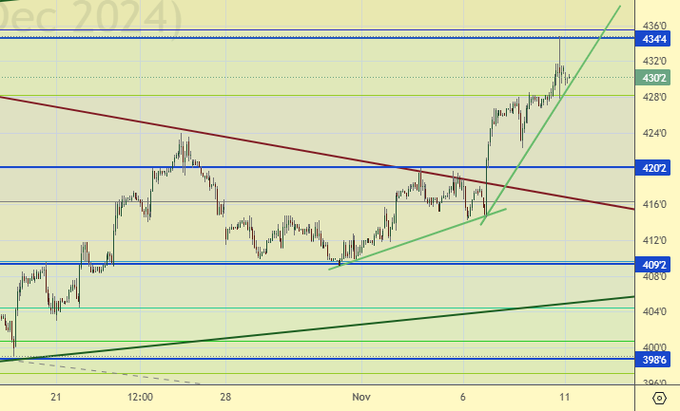 Покупка: при откате к 421.0. Стоп: 417.0. Цель: 465.0. Кто в позиции от 403.0, перенесите стоп на 428.0. Цель: 465.0.