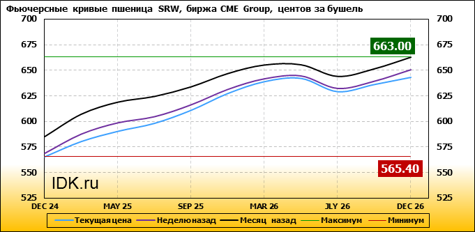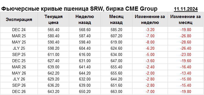 На 11.11.2024 стоимость пшеницы SRW на бирже CME Group по контракту DEC 24 составила 565.4 цента за бушель. За прошедшую неделю стоимость пшеницы SRW упала на 3.2 цента/бушель. Как мы видим на графике, фьючерсная кривая имеет периоды, когда более дальний фьючерс дешевле ближнего. Состояние бэквардации наблюдаем на следующих контрактах: JLY 26. Таким образом, трейдеры предполагают, что возможно превалирование предложения над спросом в указанные периоды.