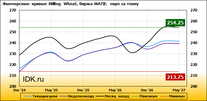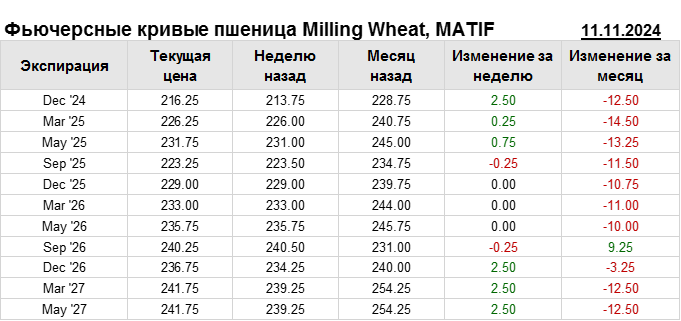На 11.11.2024 стоимость пшеницы Milling Wheat на бирже MATIF по контракту Dec ’24 составила 216.25 евро за тонну. За прошедшую неделю стоимость пшеницы Milling Wheat выросла на 2.5 евро/тонна. Как мы видим на графике, фьючерсная кривая имеет периоды, когда более дальний фьючерс дешевле ближнего. Состояние бэквардации наблюдаем на следующих контрактах: Sep ’25; Dec ’26. Таким образом, трейдеры предполагают, что возможно превалирование предложения над спросом в указанные периоды.