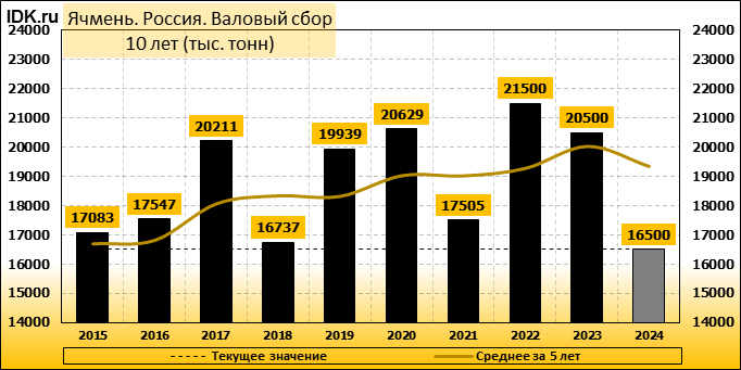 Валовый сбор: оценка пересмотрена в сторону понижения до 16500 тысяч тонн. Показатель упал на -5.71 процента.