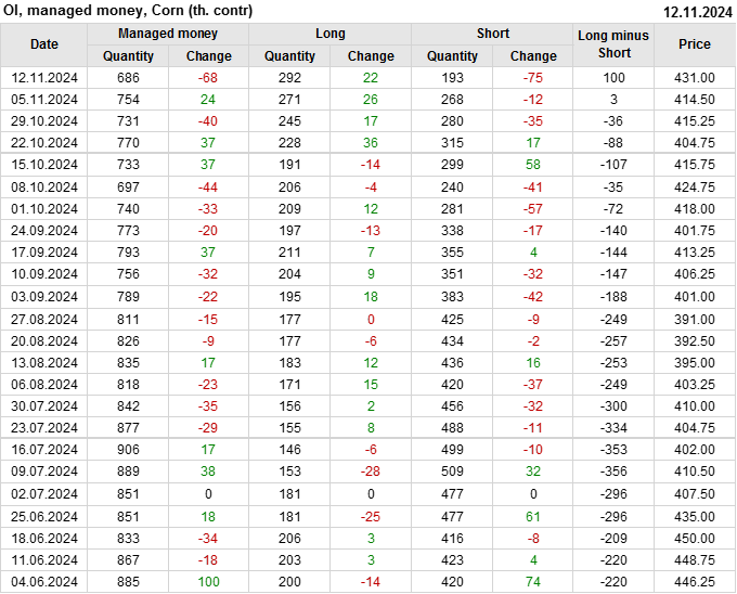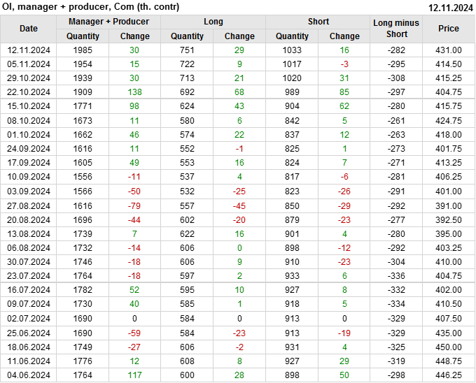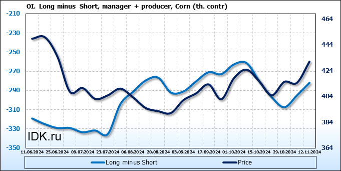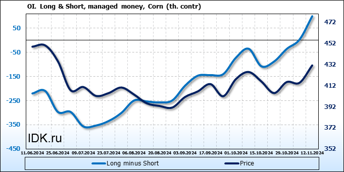 За прошлую неделю, 06.11.24 — 12.11.24, разница между длинными и короткими позициями управляющих увеличилась на 96.7 тыс. контрактов. В тоже время, цена выросла на 16.5 цента.