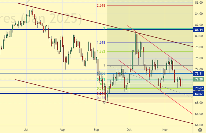 Ситуация такова, что мы пока можем рассчитывать на касание 70.00 по Brent. Дальнейшее падение на рынке нефти будет возможно только при появлении негативной информации по мировой торговле, или по росту мирового ВВП. Понимание, какими могут быть итоги 24-го года появится к середине декабря, поэтому, падение ниже 70.00 уже сейчас выглядит маловероятным.