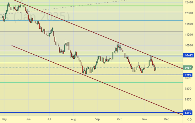 Сценарий роста: рассматриваем январский фьючерс, дата экспирации 14 января. Не размышляем о покупках пока мы ниже 1050.0.