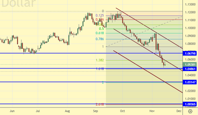 Сценарий роста: рассматриваем декабрьский фьючерс, дата экспирации 26 ноября. Ничего нового. Покупки пока не имеют смысла. Быки слабы. Ждем выхода из падающего канала вверх. Вне рынка.