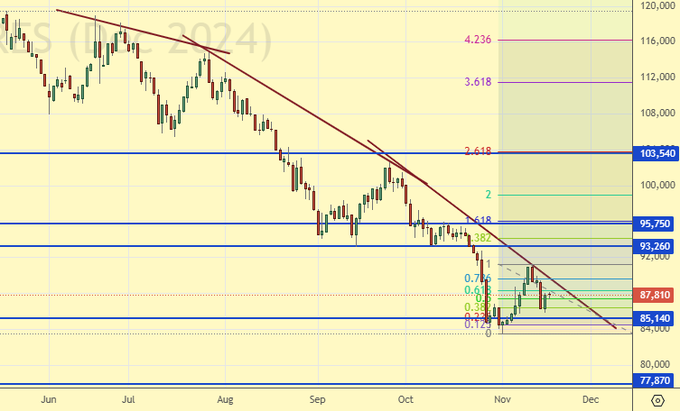 Сценарий роста: рассматриваем декабрьский фьючерс, дата экспирации 19 декабря. Дали нам откат. Купили. Но текущая позиция такова, что нам станет легче только после того, как мы вырастем выше 92000, совсем легко после роста выше 96000.