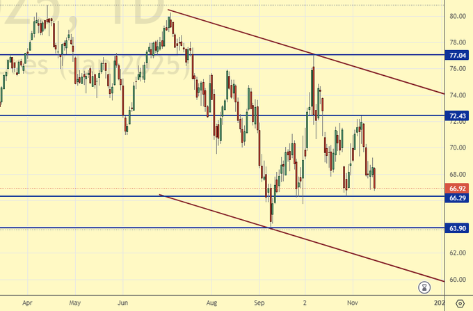 Сценарий роста: рассматриваем ноябрьский фьючерс, дата экспирации 29 ноября. На рынке баланс, что вредно для спекуляций. Для покупок можно использовать возможную попытку прохода ниже 70.00.