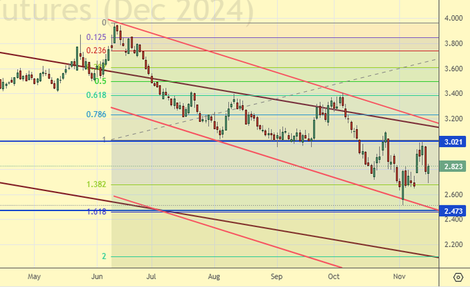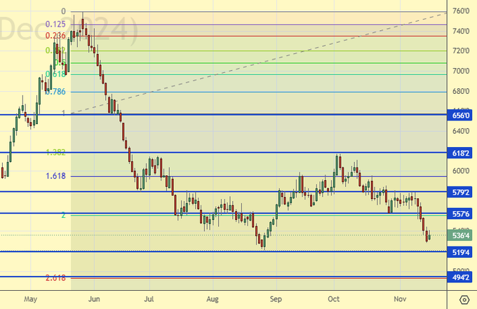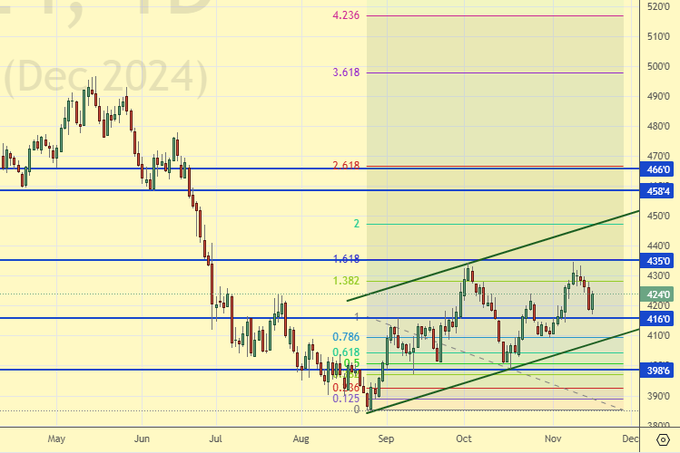 Сценарий роста: рассматриваем декабрьский фьючерс, дата экспирации 13 декабря. Быки-спекулянты пришли на рынок, но они наталкиваются на распродажи со стороны производителей, что пока размывает влияние управляющих на ситуацию. Отметим, что ход к 465.0, с точки зрения техники, пока не отменен.