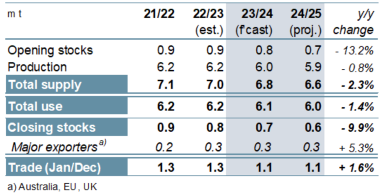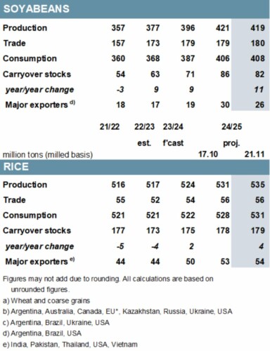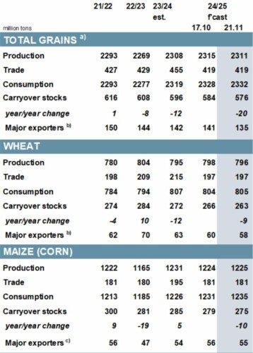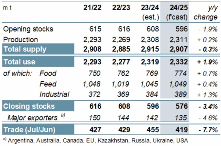 Последняя оценка мирового спроса и предложения зерна (пшеницы и фуражного зерна) на 2024/25 гг. предполагает дальнейшее ужесточение прогноза, поскольку прогноз производства снижен, а потребления — выше, чем раньше. Производство зерновых теперь ожидается на уровне 2 311 млн т, что на 4 млн т меньше, чем в прошлом месяце, в основном из-за снижения оценок по ячменю и пшенице.