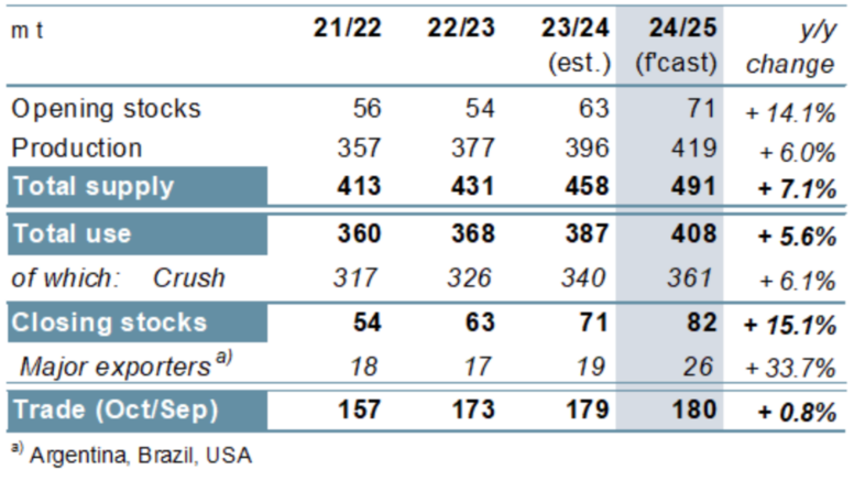 Благодаря ожиданиям значительного урожая у основных производителей и экспортеров, мировое производство соевых бобов вырастет на 6% по сравнению с аналогичным периодом прошлого года и достигнет рекордных 419 млн т. Ожидается, что рост будет носить широкий характер и охватит множество регионов и сегментов рынка, общая загрузка увеличится до нового пика, в то время как ожидается значительное накопление запасов у трех основных производителей. В связи с превышением средних объемов поставок в Азию, Европу и Африку, прогнозируется рост торговли до 180 млн т (+1%).
