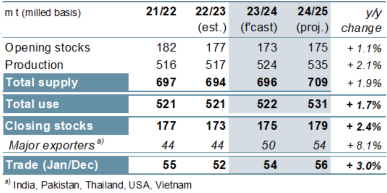 Мировое производство риса в 2024/25 гг. вырастет на 2% по сравнению с предыдущим годом и достигнет рекордного уровня в 535 млн т. Учитывая обильные запасы, рост спроса на продовольствие приведет к увеличению общего потребления до нового максимума, в то время как ожидается увеличение запасов. Прогнозируется, что мировой импортный спрос вырастет на 3% г/г благодаря потенциально более высокому спросу в Африке, что более чем компенсирует сокращение поставок на некоторые азиатские рынки. Благодаря экспорту, превышающему 20 млн т, Индия увеличит свою долю в общем объеме торговых потоков.