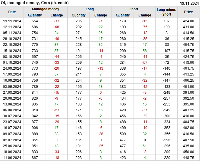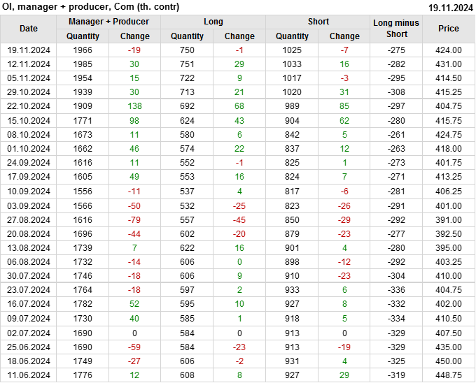 За прошлую неделю, 13.11.24 — 19.11.24, разница между длинными и короткими позициями управляющих увеличилась на 7.3 тыс. контрактов. В тоже время, цена упала на 7 центов.