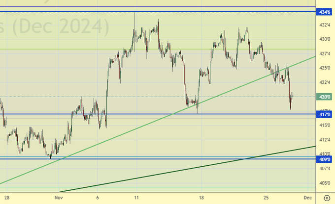 Продажа: нет. Кто в позиции от 426.0, перенесите стоп на 429.0. Цель: 370.0.