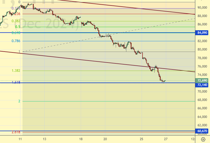 Откат вверх к 80000 (если он будет) можно использовать для продаж. Цель: 60000. Если же падение продолжится, то можно внутри дня присоединяться к падению. Отметим, что в рамках данного прогноза давать точки входа для внутридневной торговли невозможно. Толпа хотела ралли под Новый год, может быть еще оно и состоится… А если нет, то глубина разочарования может поразить воображение.