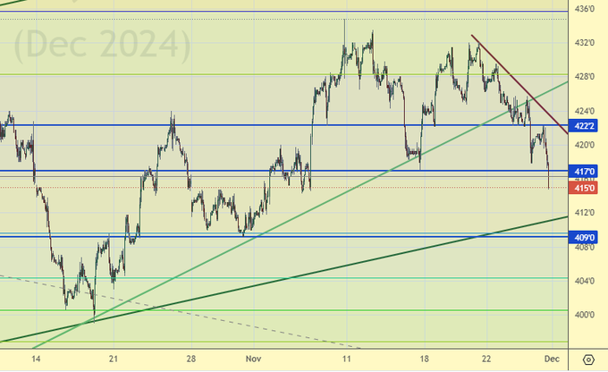Продажа: нет. Кто в позиции от 426.0, перенесите стоп на 427.0. Цель: 370.0.