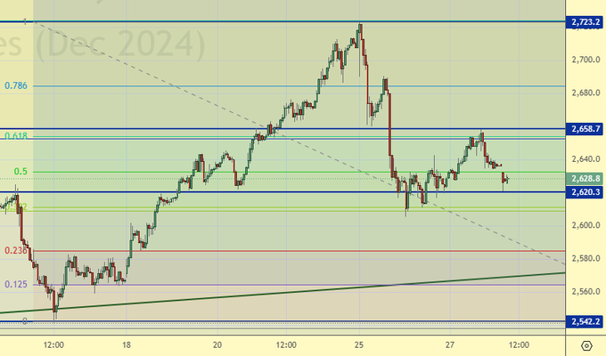 2585 – это уровень, к которому может опустится золото без ущерба для построения тренда вверх. Дальнейшее падение вызовет приток на рынок продавцов. Видим, что день открылся вниз, однако, мы способны удержаться выше 2610. В США День благодарения – выходной.