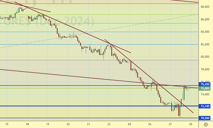Подошли вплотную к 70000. Видим откат на фоне укрепления рубля к концу сессии. Нам надо 80000 для нового входа в шорт. Стоит ли покупать? Нет. Мы ждем 60000. Возможно, что и данная отметка не будет пределом. Народ продолжит сбрасывать большую часть бумаг. В живых останутся только Лукойл и Норникель.