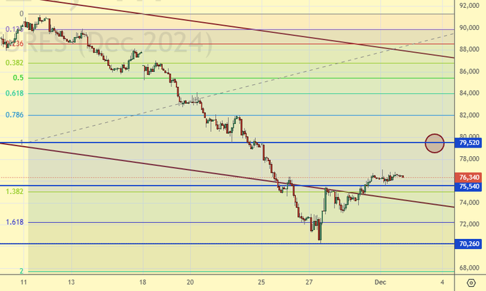 Ничего нового. Пока ждем рост к 80000. Там можно будет продать. Более высокое восстановление рынка должно быть подкреплено политической нормализацией, но об этом говорить на данный момент невозможно.