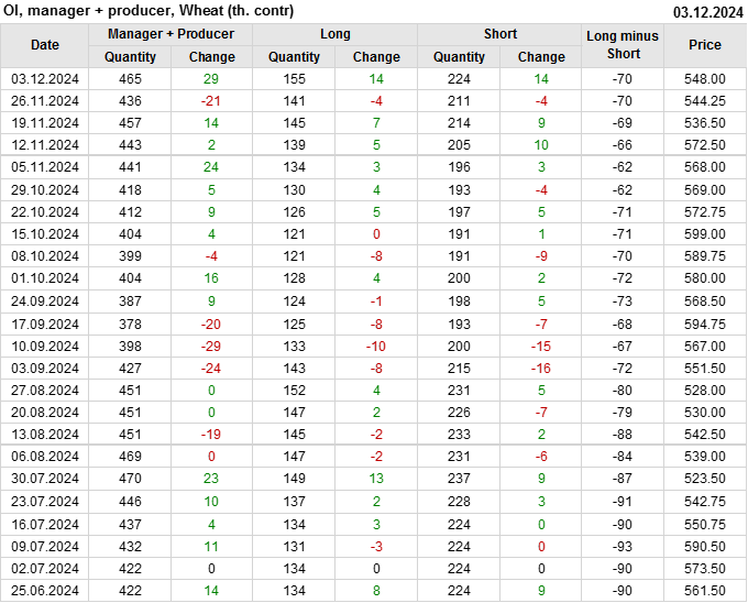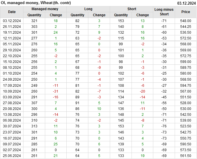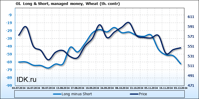 За прошедшую неделю, 27.11.24 — 03.12.24, разница между длинными и короткими позициями управляющих увеличилась на 10.2 тыс. контрактов. В тоже время, цена выросла на 3.75 цента.
