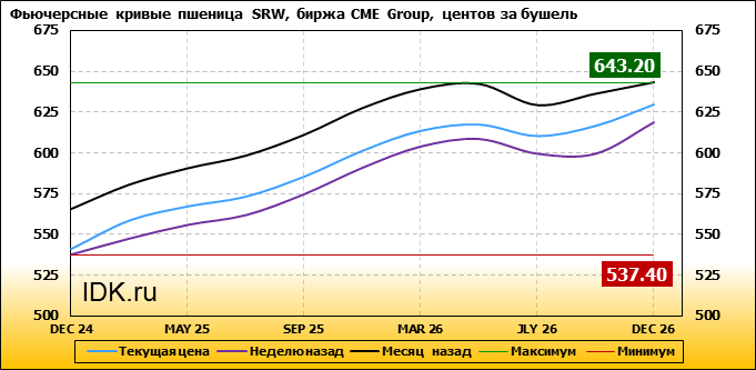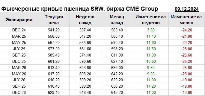 На 09.12.2024 стоимость пшеницы SRW на бирже CME Group по контракту DEC 24 составила 541.2 цента за бушель. За прошедшую неделю стоимость пшеницы SRW выросла на 3.8 цента/бушель. Как мы видим на графике, фьючерсная кривая имеет периоды, когда более дальний фьючерс дешевле ближнего. Состояние бэквардации наблюдаем на следующих контрактах: JLY 26. Таким образом, трейдеры предполагают, что возможно превалирование предложения над спросом в указанные периоды.