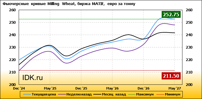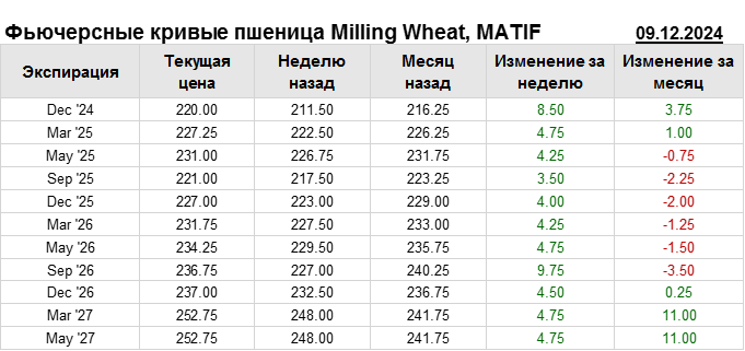 На 09.12.2024 стоимость пшеницы Milling Wheat на бирже MATIF по контракту Dec ’24 составила 220 евро за тонну. За прошедшую неделю стоимость пшеницы Milling Wheat выросла на 8.5 евро/тонна. Как мы видим на графике, фьючерсная кривая имеет периоды, когда более дальний фьючерс дешевле ближнего. Состояние бэквардации наблюдаем на следующих контрактах: Sep ’25; May ’27. Таким образом, трейдеры предполагают, что возможно превалирование предложения над спросом в указанные периоды.