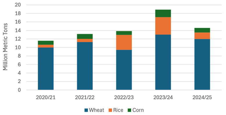 Индонезия — постоянный крупный импортер пшеницы, поскольку производство в стране отсутствует, а предпочтение отдается доступным по цене основным продуктам питания на основе пшеницы, таким как лапша быстрого приготовления. В 2023/24 году импорт пшеницы увеличился на 38% по сравнению с предыдущим годом, что позволило компенсировать ограниченные начальные запасы. Ожидается, что в 2024/25 году импорт пшеницы уменьшится. В текущем маркетинговом году сокращение импорта от основного поставщика Австралии частично компенсируется увеличением импорта из Канады и США. Импорт из Украины в текущем маркетинговом году был значительным, однако ожидается, что темпы его замедлятся, учитывая плотные запасы.