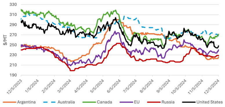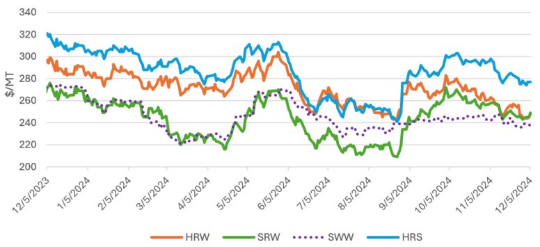 Внутренние цены: Котировки в США снизились по всем классам с момента публикации ноябрьского прогноза WASDE. Цена на твердую красную яровую упала на $19 за тонну до $277 из-за жесткой конкуренции со стороны Канады. Твердая красная озимая упала на $14/тонна до $248, а мягкая красная озимая — на $9/тонна до $249, так как показатели состояния озимой пшеницы значительно улучшились после повсеместных дождей за последний месяц, а сильная экспортная конкуренция со стороны Аргентины оказала дальнейшее давление на цены. Мягкая белая озимая потеряла $5/тонна до $238, так как давление на цены из-за благоприятных условий выращивания было ослаблено сильным экспортом на рынки Восточной Азии.