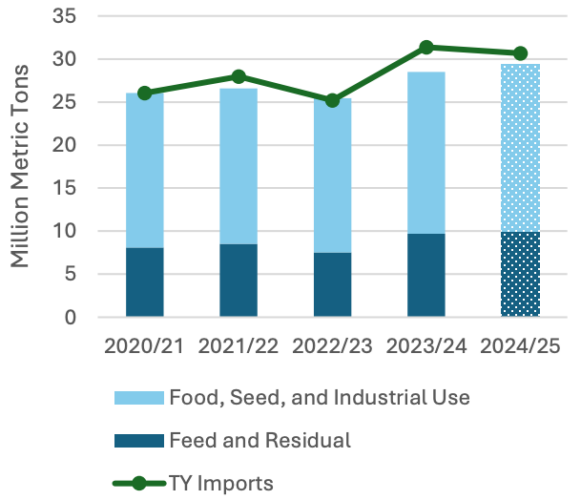 В 2023/24 году Индонезия импортировала рекордное количество зерна, что на 30 % больше, чем в предыдущем маркетинговом году. Помимо сохраняющихся тенденций роста населения и изменения рациона питания, дефицит внутреннего производства из-за задержки осадков вызвал шквал закупок в государственном и частном секторах. Однако с улучшением перспектив производства в 2024/25 году ожидается снижение импорта.