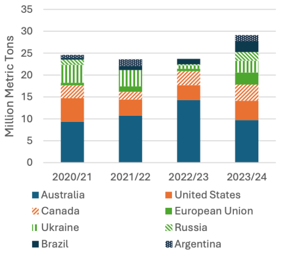 Экспорт в регион из Украины, России и Европейского союза резко вырос в 2023/24 году, компенсировав снижение экспорта из Австралии. Эти поставщики с более низкими ценами увеличили поставки пшеницы фуражного качества в Юго-Восточную Азию и, как правило, отправляют большую часть своего экспорта в регион в первой половине торгового года. В первые 3 месяца 2024/25 года (июль-сентябрь) Украина была доминирующим поставщиком, отгрузив более 2 млн тонн, в то время как Россия экспортировала в регион менее половины этого объема, а экспорт из ЕС снизился из-за меньшего урожая.