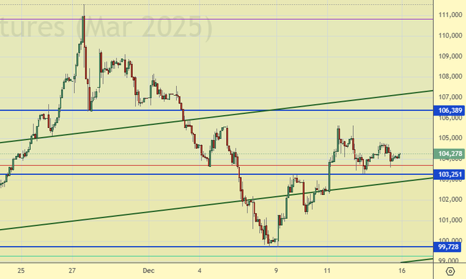 Продажа: при подходе к 106300. Стоп: 107300. Цель: 98000. Или сейчас (104278). Стоп: 105600. Цель: 98000.