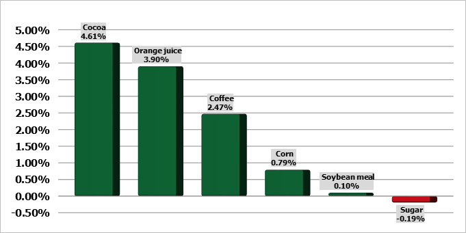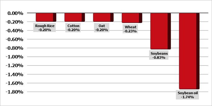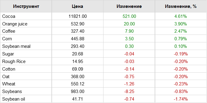 Соевые бобы в понедельник в полдень потеряли от 3 до 5 центов, так как данные Национальной ассоциации переработчиков масличных культур (NOPA) оказались ниже прогнозов. Фьючерсы на соевую муку выросли на $1,30 за тонну за день. В пятницу вечером была осуществлена 141 поставка, в результате чего общее количество контрактов достигло 2,662. Данные по экспорту свидетельствуют о поставках 1,676 млн тонн соевых бобов за неделю, завершившуюся 12 декабря. Это на 3,5% меньше, чем на предыдущей неделе, но на 17,6% больше, чем на той же неделе прошлого года. Крупнейшим пунктом назначения стал Китай — 1,026 млн тонн, еще 191759 млн тонн было отправлено в Мексику.
