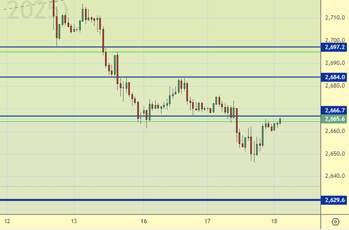 Затолкали рынок почти к 2640, обозначив претензию на посещение 2630. Падение ниже 2630, скорее всего, приведет к разгону тренда вниз с дальней целью на 2140. Учитывая то, что все центральные банки (развитых стран) сейчас находятся в цикле снижения ставок, снижение ставки по доллару не должно обрушить его позиции относительно других валют и относительно золота.