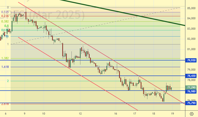Продажа: нет. Кто в позиции от 80400 (с учетом перехода на новый контракт), перенесите стоп на 78200. Цель: 70000.