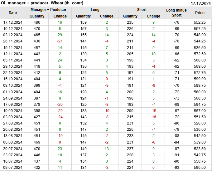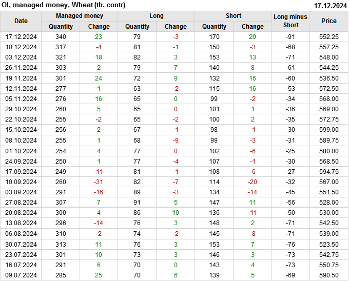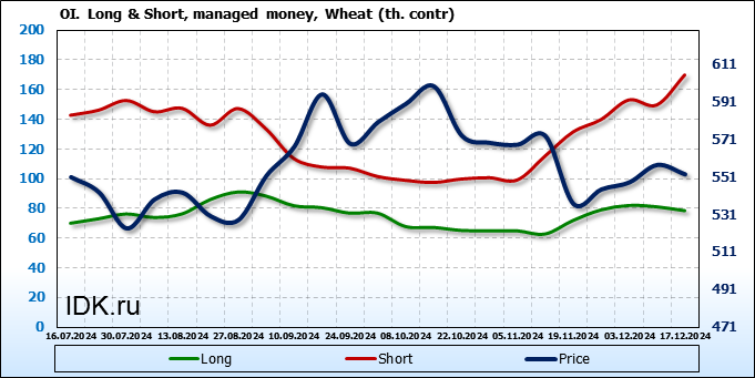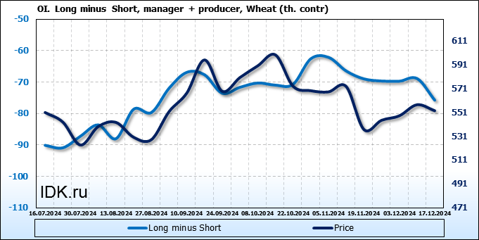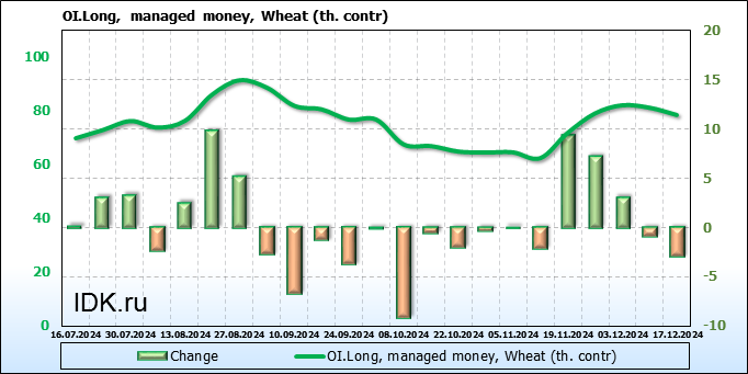 За прошедшую неделю, 11.12.24 — 17.12.24, разница между длинными и короткими позициями управляющих увеличилась на 22.9 тыс. контрактов. В тоже время, цена упала на 5 центов.