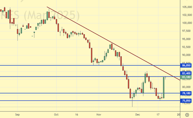 Сценарий роста: рассматриваем мартовский фьючерс, дата экспирации 20 марта. Кто бы мог подумать… А оно вон как. Радости от оставшейся на уровне ставки в 21% полные штаны. Честное слово. Народ, это двадцать один процент, это не 2.1%. Чудеса всё «чудастее». Купить? Только при откате к 78200.