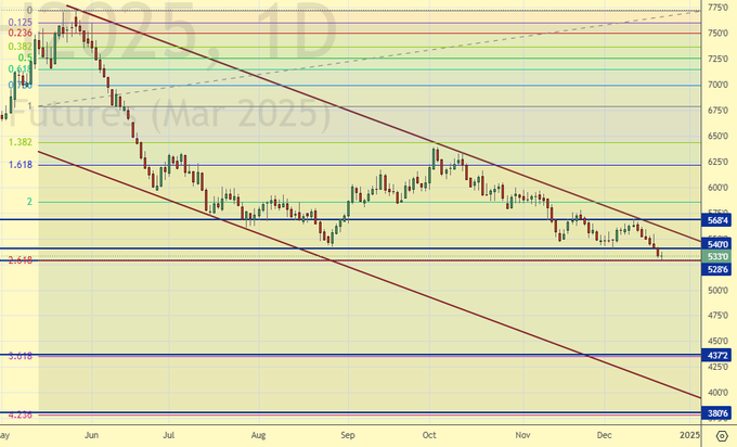 Сценарий роста: рассматриваем мартовский контракт, дата экспирации 14 марта. Видим новый локальный минимум. Покупателям тут, казалось бы, и делать нечего, но мы пришли к уровню Фибо. Можно купить с небольшим риском.