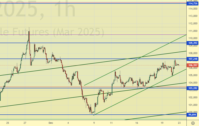 Ставка ЦБ РФ осталась без изменений. И если при её росте можно было бы помечтать о 98000, то теперь у нас только 115000 и ничего иного нет. А вот в феврале, будет ставка повышена, и мы от 115000 сходим на 105000. И всем хорошо. Рост рассматриваем после роста выше 108000. Покупки возможны при падении к 102500.