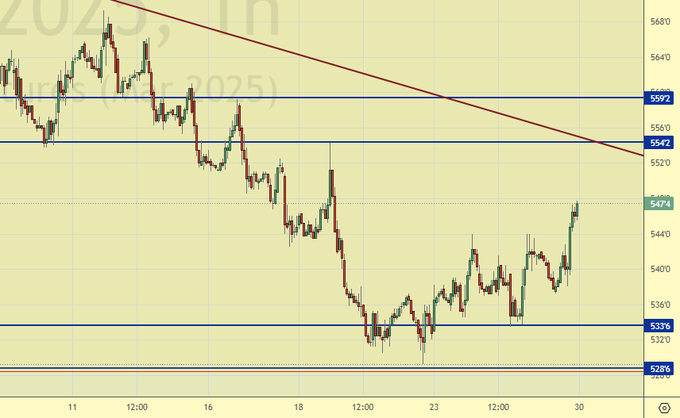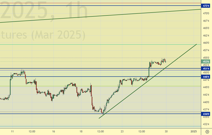 Рынок не откатывает на протяжении уже нескольких сессий. Мы замираем в узком диапазоне, а затем продолжаем расти. Весьма вероятно, что мы придем к 472.0. Более сильный рост пока не рассматриваем.