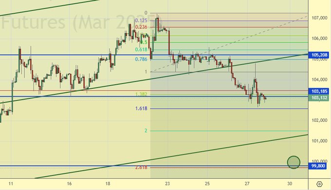 Итак, мы на 102500. Чем дольше пишешь об уровне, тем выше вероятность, что рынок к нему придет. В техническом анализе сознание первично. Здесь можно купить. Стоп далеко не относим. Ход к 100000 не отрицаем.
