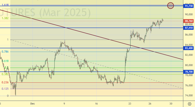 Продажа: при подходе к 91700. Стоп: 92700.Цель: 79000. Кто в позиции от 89000, держите стоп на 90200. Цель: 79000.